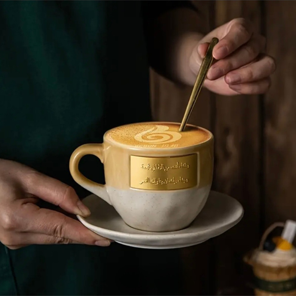أضف لمسة من الفخامة والهدوء إلى روتينك اليومي مع كوب الأناقة العربية المصنوع من السيراميك بدرجتي بني أنيقتين، والمزود بصحن سفلي بلون متناسق. يتميز الكوب بعبارة عربية محفزة محفورة على لوح معدني ذهبي، ليكون أكثر من مجرد كوب – هو لحظة من الإلهام في كل رشفة.