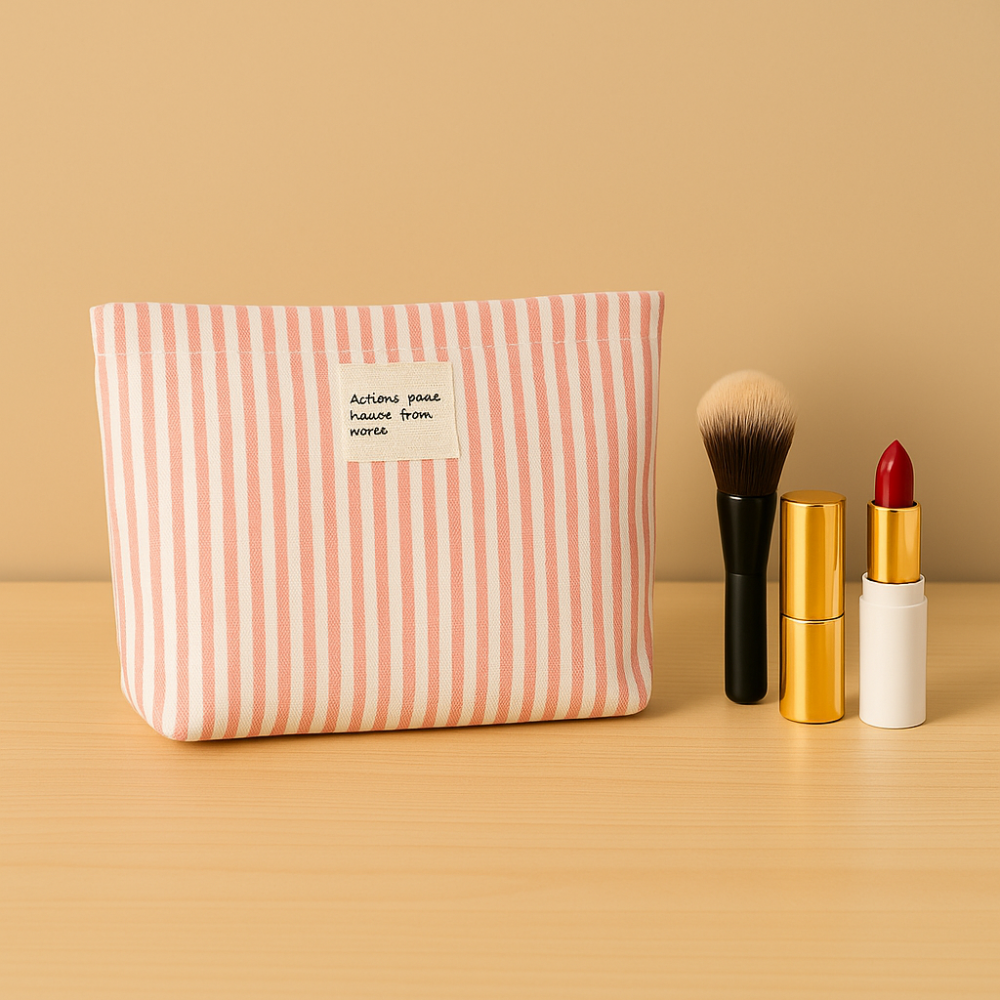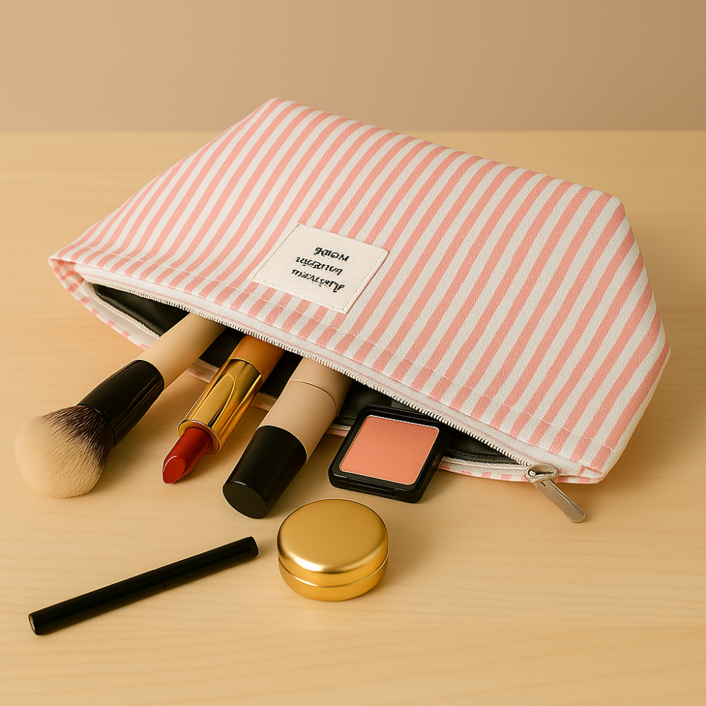 شنطة مكياج عصرية بتصميم مخطط أنيق بلون وردي وأبيض، مصنوعة من قماش متين وخفيف، ومزودة بسحاب علوي لسهولة الفتح والإغلاق. مثالية لتنظيم مستحضرات التجميل أو الإكسسوارات أو الأدوات الصغيرة أثناء السفر أو الاستخدام اليومي.
