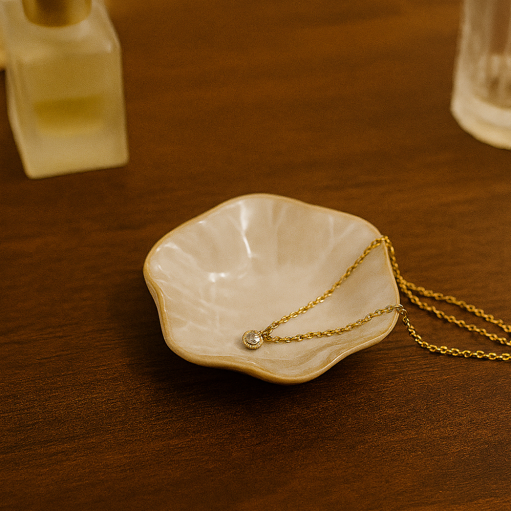 صحن صغير من السيراميك بلون أبيض هادئ ولامع، بتصميم زهرة أنيق لحفظ المجوهرات أو القطع الصغيرة.