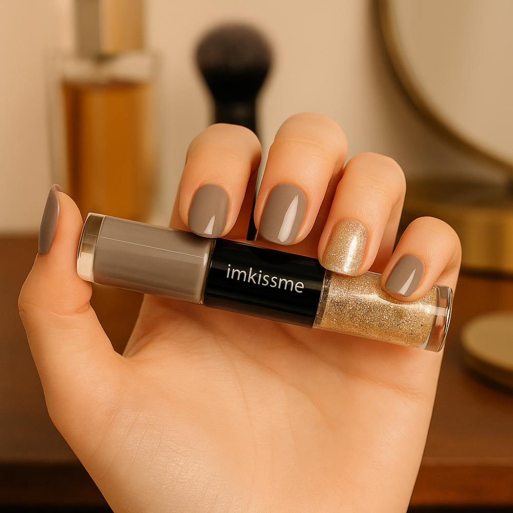 أبهري الجميع بأظافر متجددة وجذابة مع مناكير imkissme المزدوج، يجمع بين الرمادي العصري واللميع الذهبي الوردي البراق.