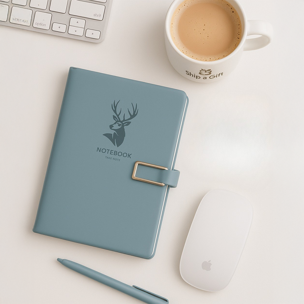 دفتر ملاحظات أنيق بغلاف جلدي ناعم بلون أزرق مخضر وقفل معدني ذهبي، مزين بطباعة غزال راقية. مثالي لتدوين الملاحظات اليومية أو استخدامه كهديّة عملية وأنيقة في المناسبات أو العمل.