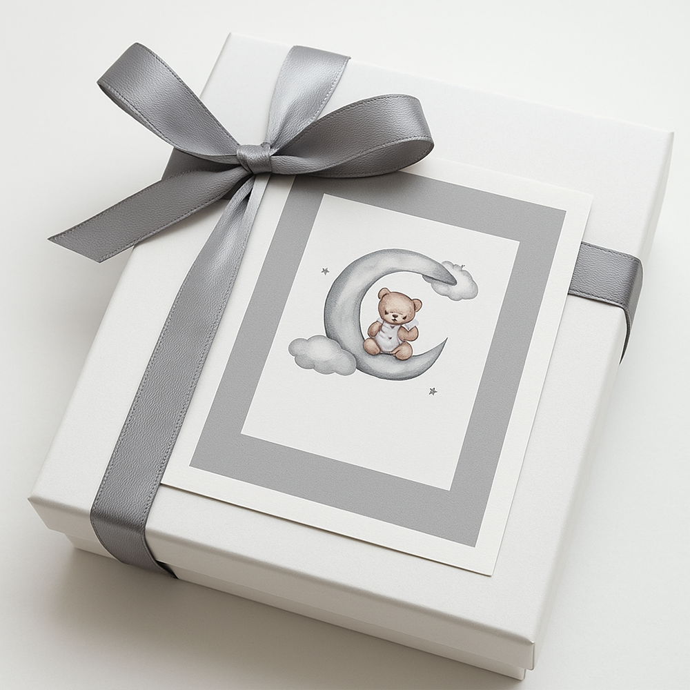 بطاقة تهنئة أنيقة بتصميم لطيف لدب صغير جالس على هلال وسط الغيوم والنجوم، مناسبة للاحتفال بمولود جديد. تضيف لمسة دافئة لأي هدية بيبي شاور أو زيارة ولادة بتصميم رمادي هادئ ومميز.