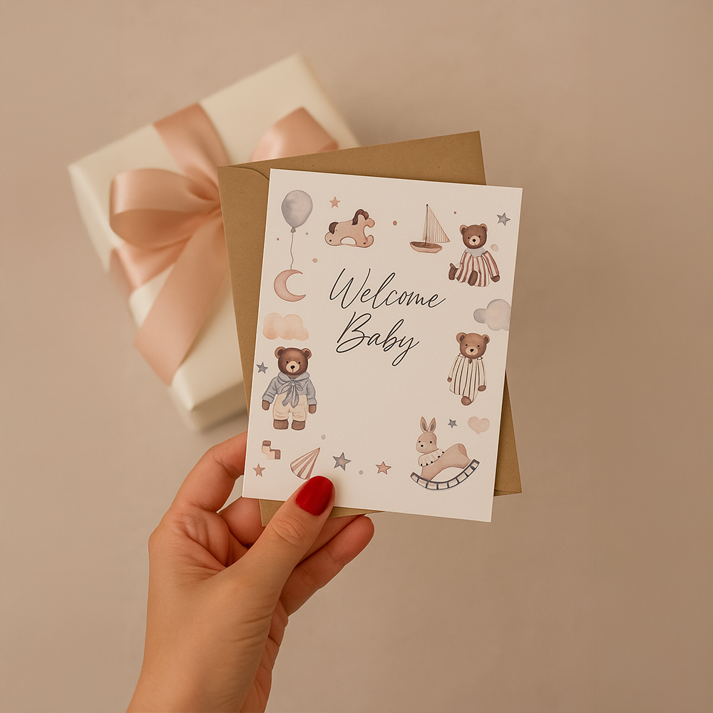 بطاقة تهنئة أنيقة للمولود الجديد تحمل عبارة "Welcome Baby" بتصميم هادئ ورسومات ناعمة تشمل دمى ودببة وألعاب أطفال كلاسيكية مثل الحصان الهزاز والمراكب الورقية. مثالية لتقديمها مع هدية مواليد أو في حفلات الاستقبال الأولى.