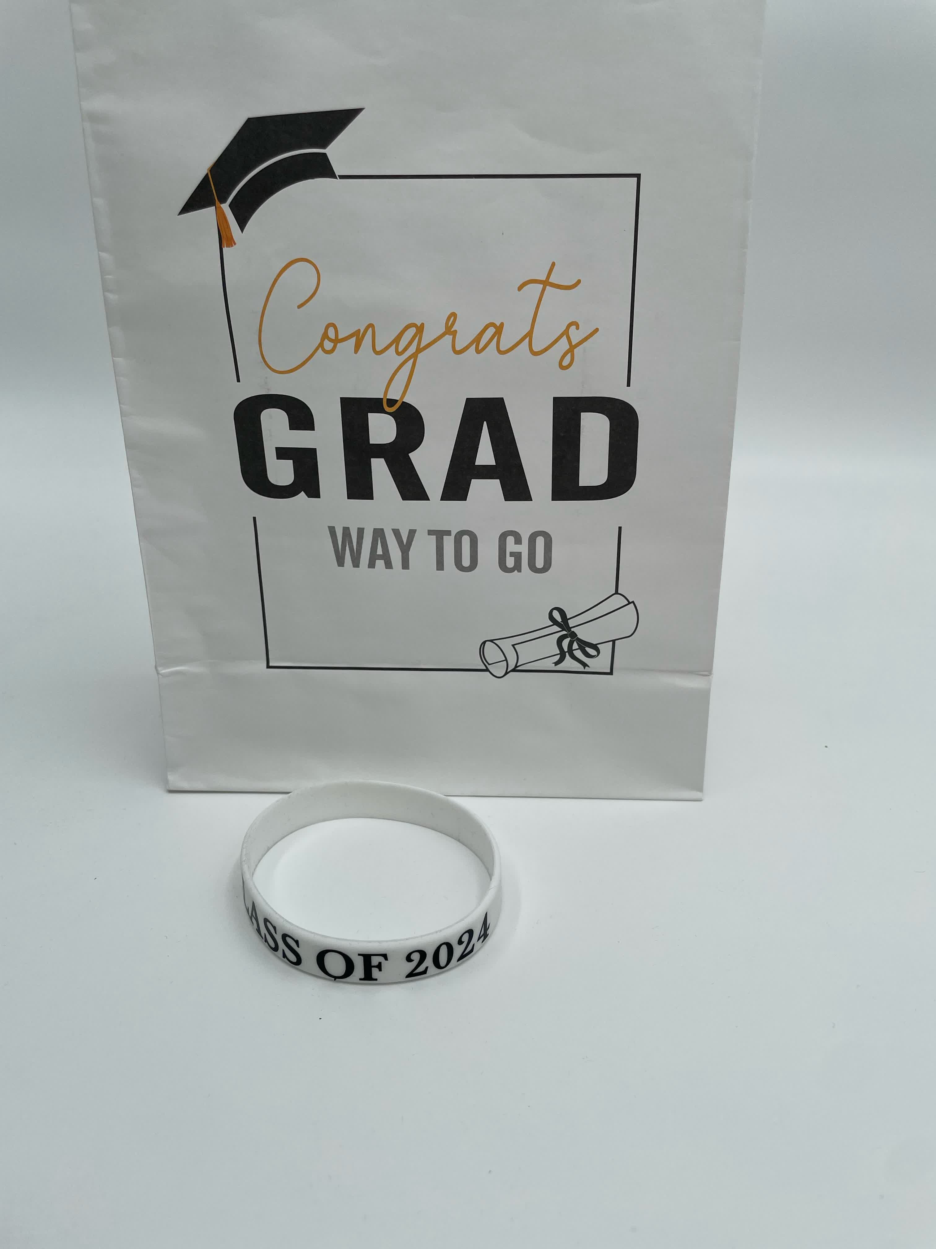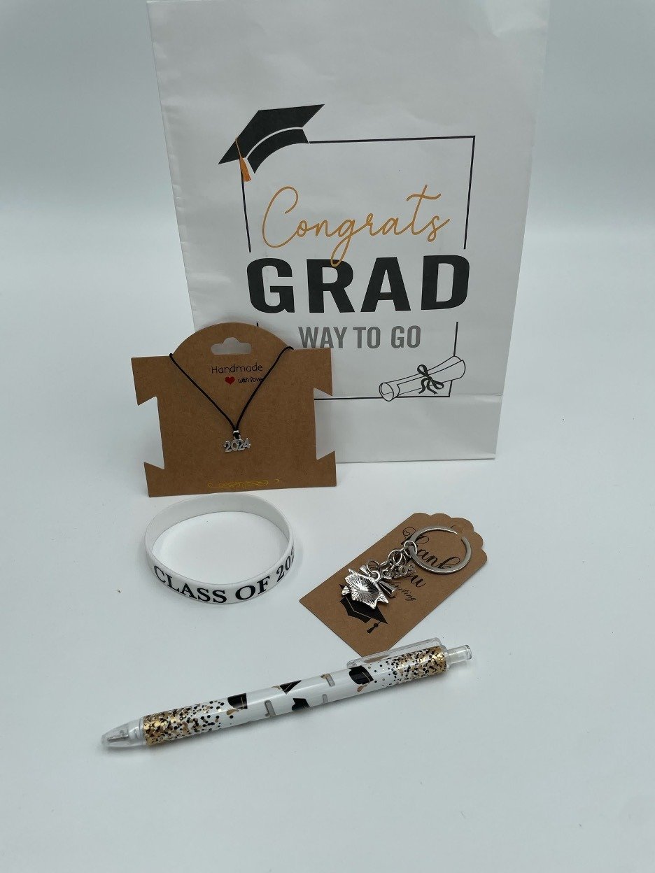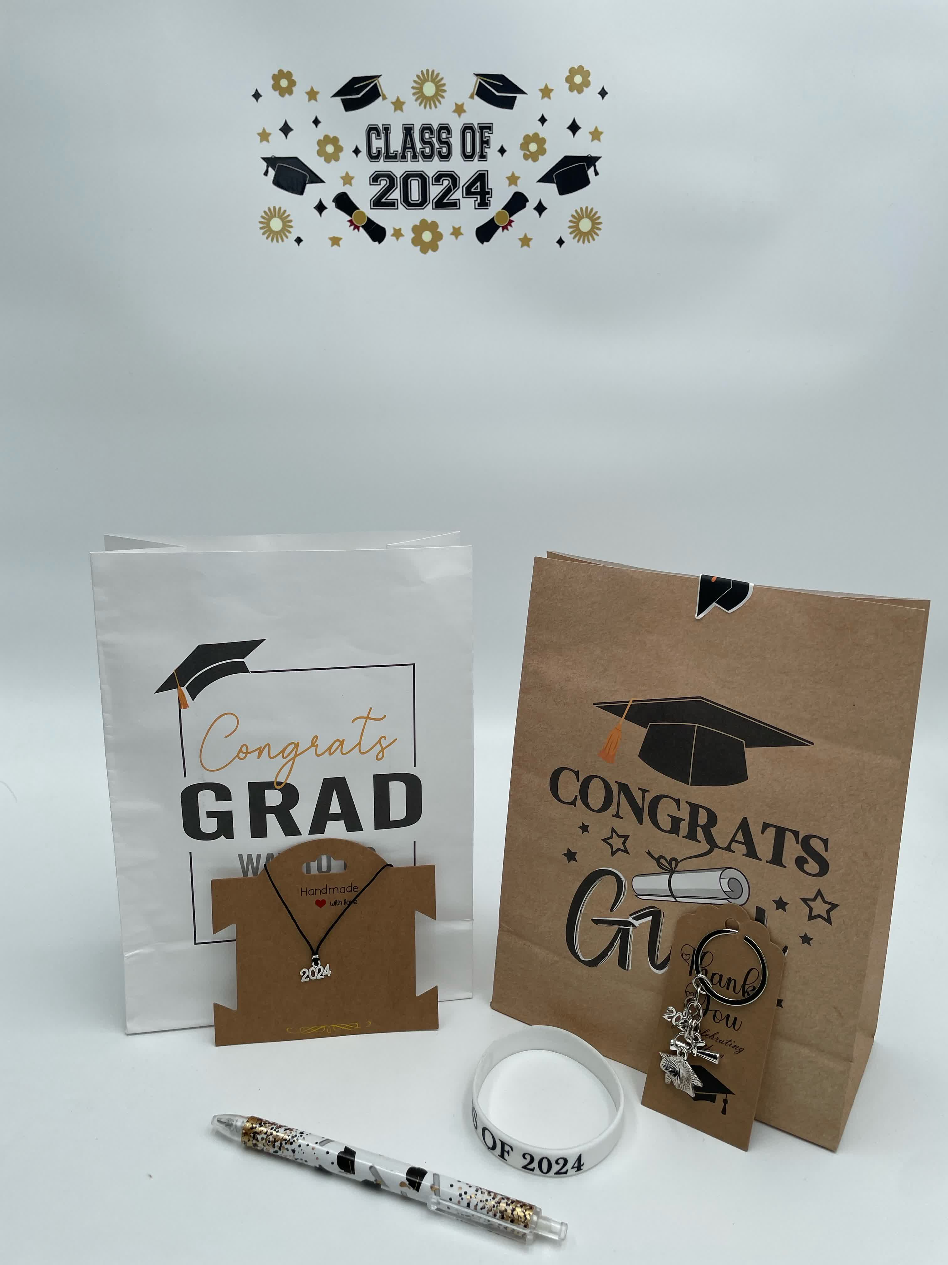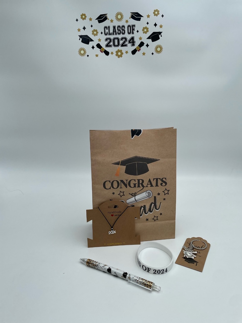 تحتوي الهدية على :تعليقه تخرج لدفعة لعام 2024 سلسلة مفاتيح للتخرج لدفعة لعام 2024 قلم للتخرجاساور للتخرج لدفعه 2024 ( اللون ابيض او اسود و الاختيار يكون عشوائي بحسب المتوفر )كيس ورقي لتقديم التوزيعات