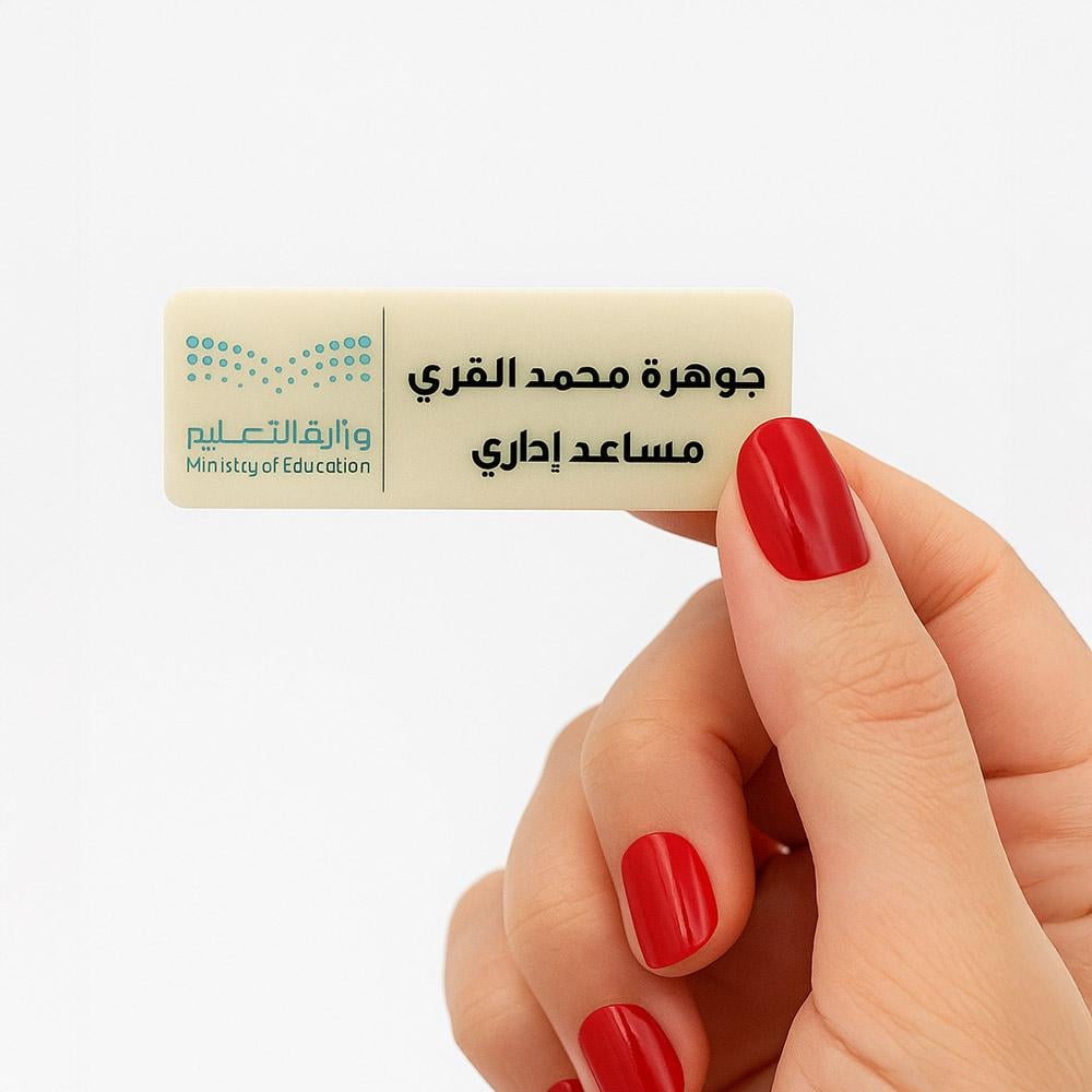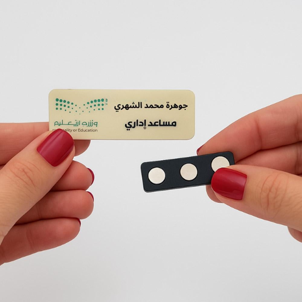 بروش أنيق مخصص للتعريف بالاسم، يتميز بتثبيت مغناطيسي آمن بدلاً من الدبوس التقليدي، مما يحافظ على الملابس دون أي خدوش أو ثقوب. مناسب للاستخدام في بيئات العمل، المدارس، والفعاليات الرسمية.