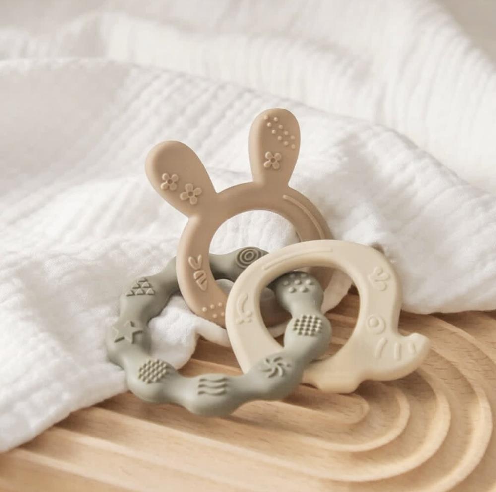 تصميم مزدوج يجمع بين الأرنب اللطيف وزهرة السيليكون، مع خرز ناعم وخاتم خشبي طبيعي لتجربة تهدئة آمنة وممتعة للرضع. مثالية للتهدئة أثناء مرحلة التسنين ومناسبة لليد الصغيرة للإمساك بها.