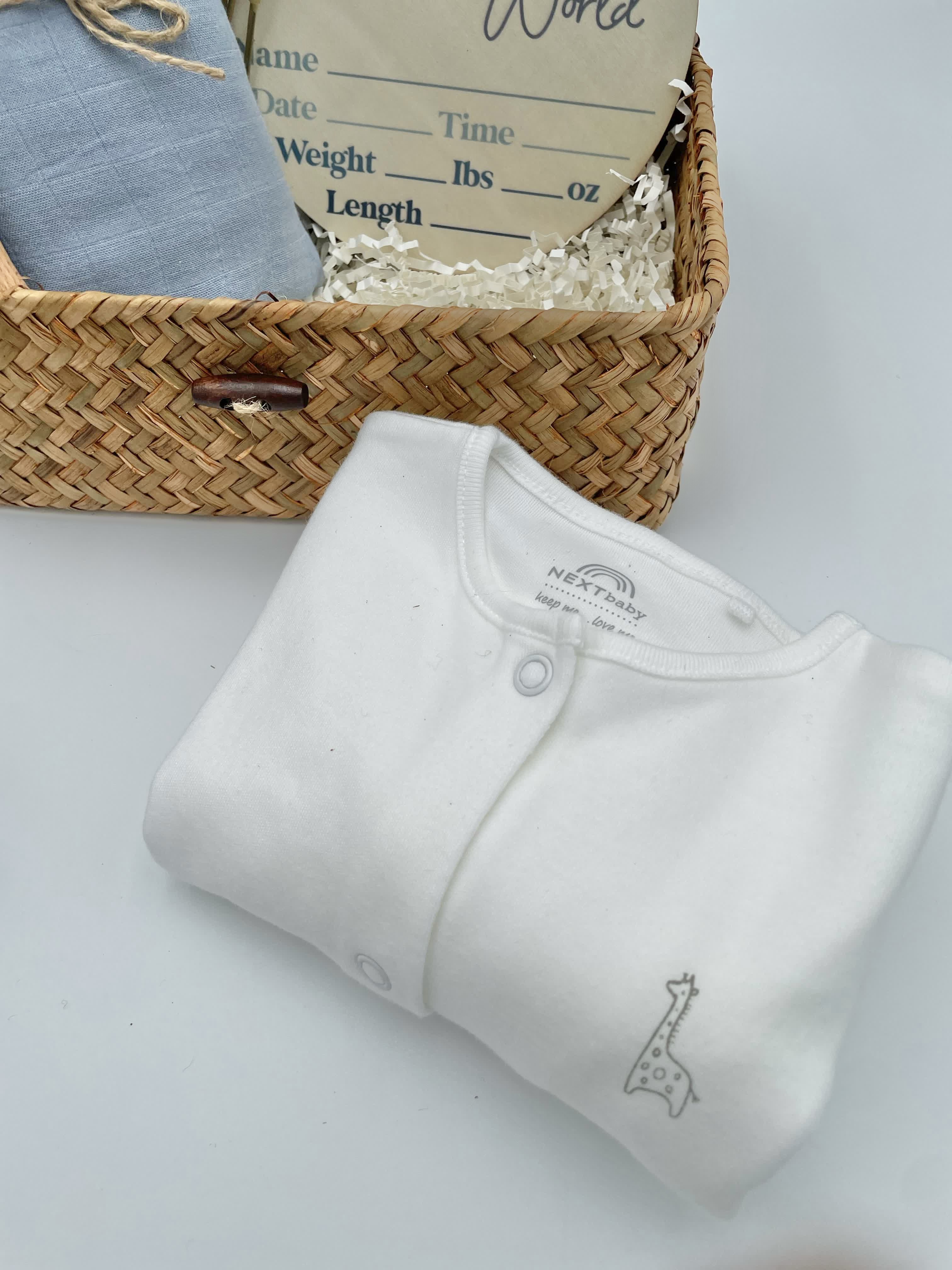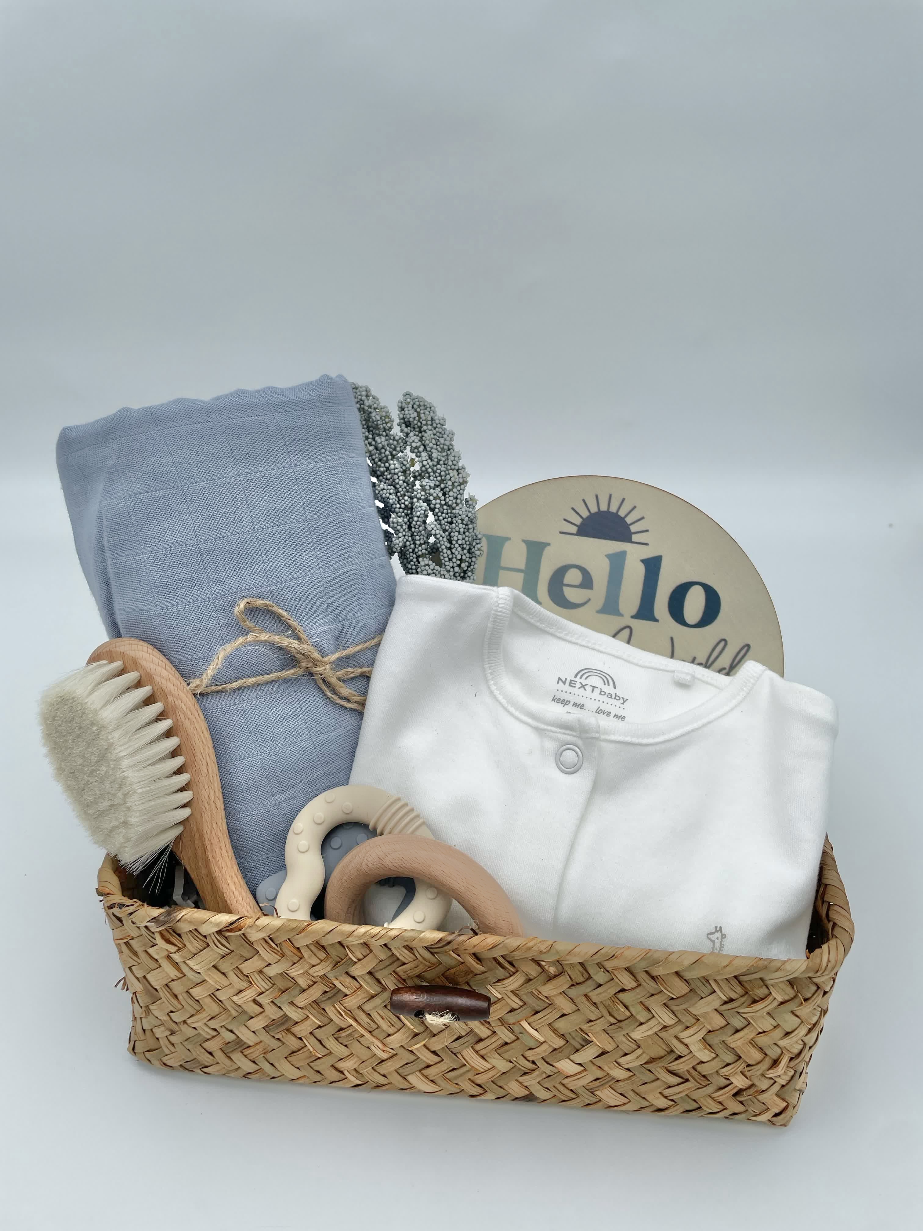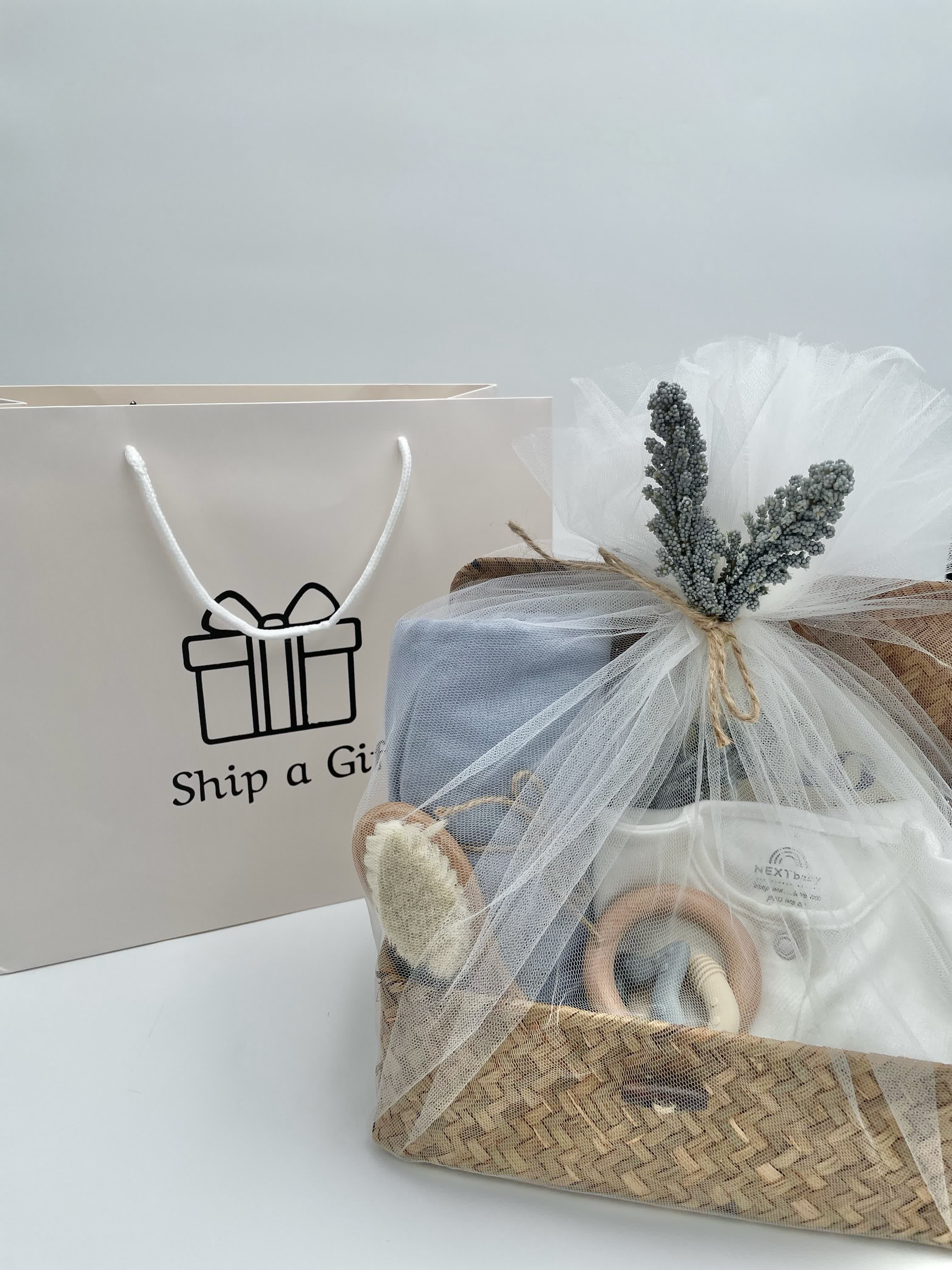 - تقدم الهدية في بوكس من الخوص و تكون مغلفة بالتل كما في الصورة مما يجعلها خيارًا رائعًا لهدية مولود .